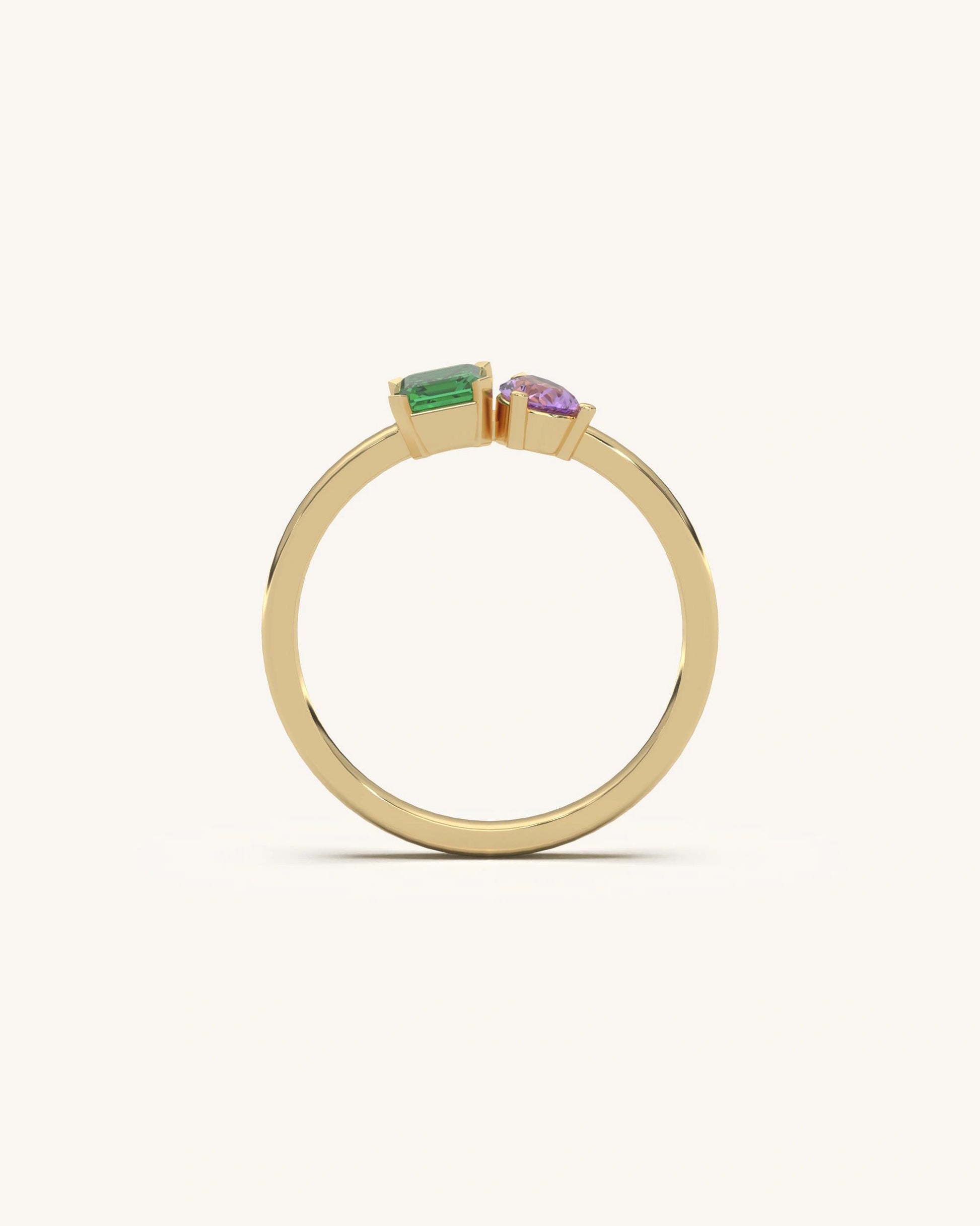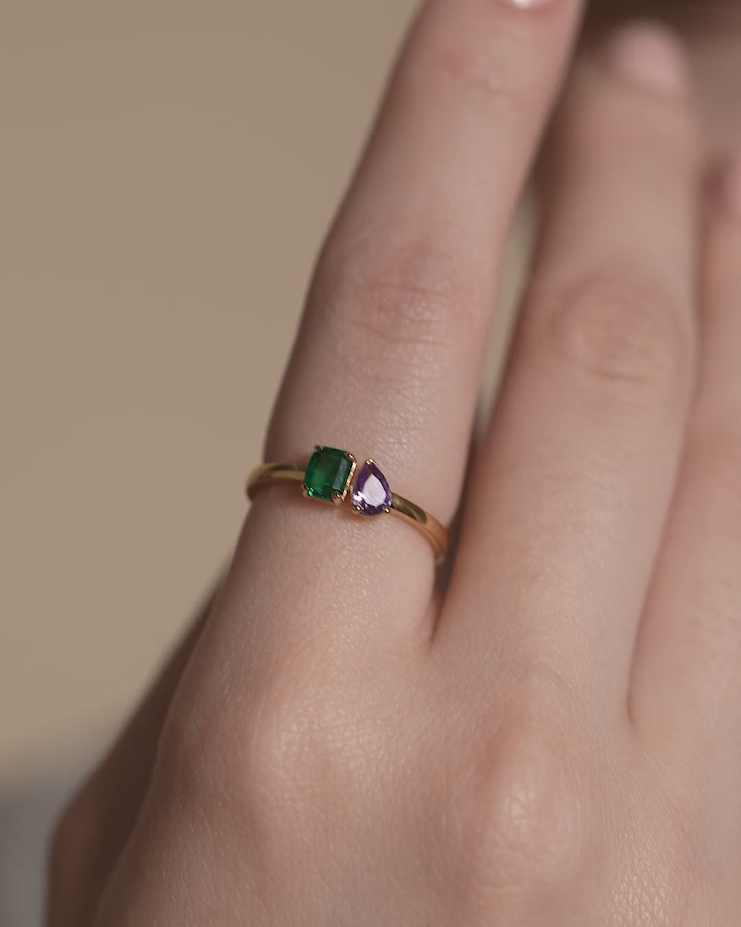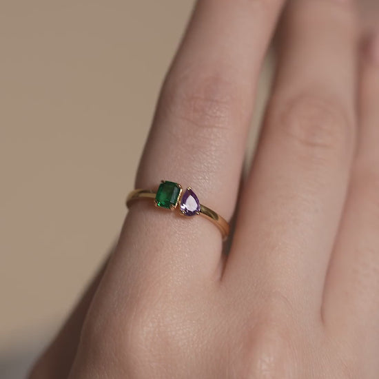 This sleek ring features a contrast of emerald and pear-cut sapphire colorstones. A playful yet elegant pairing, perfect for stacking or standalone style.