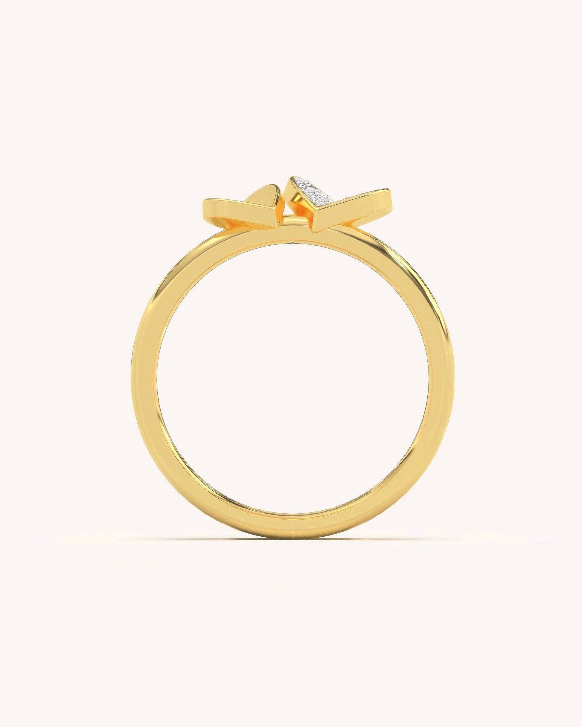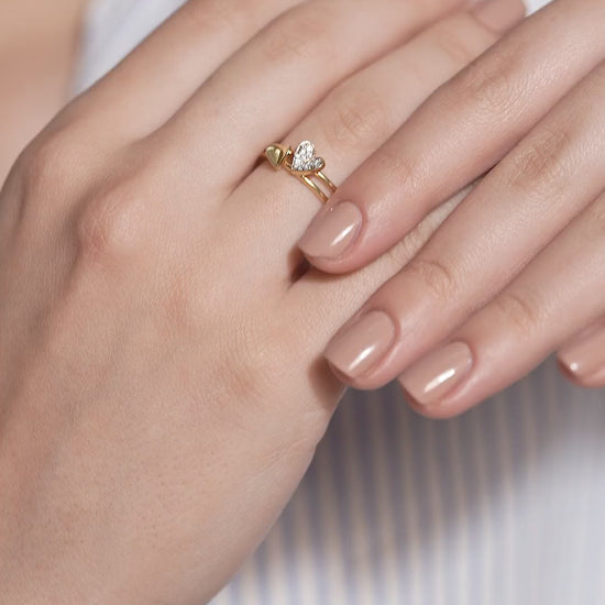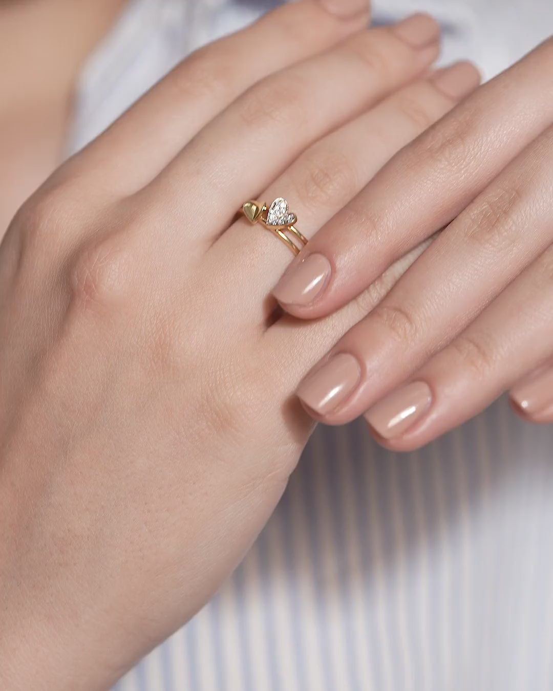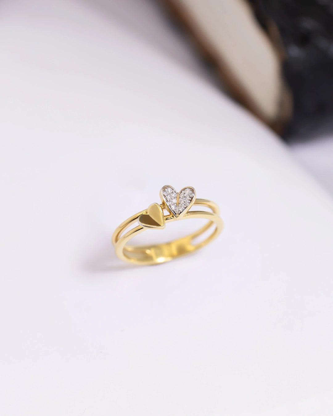 A trendy double band ring with two hearts—one half-studded and one plain—placed slightly tilted for a fun look.