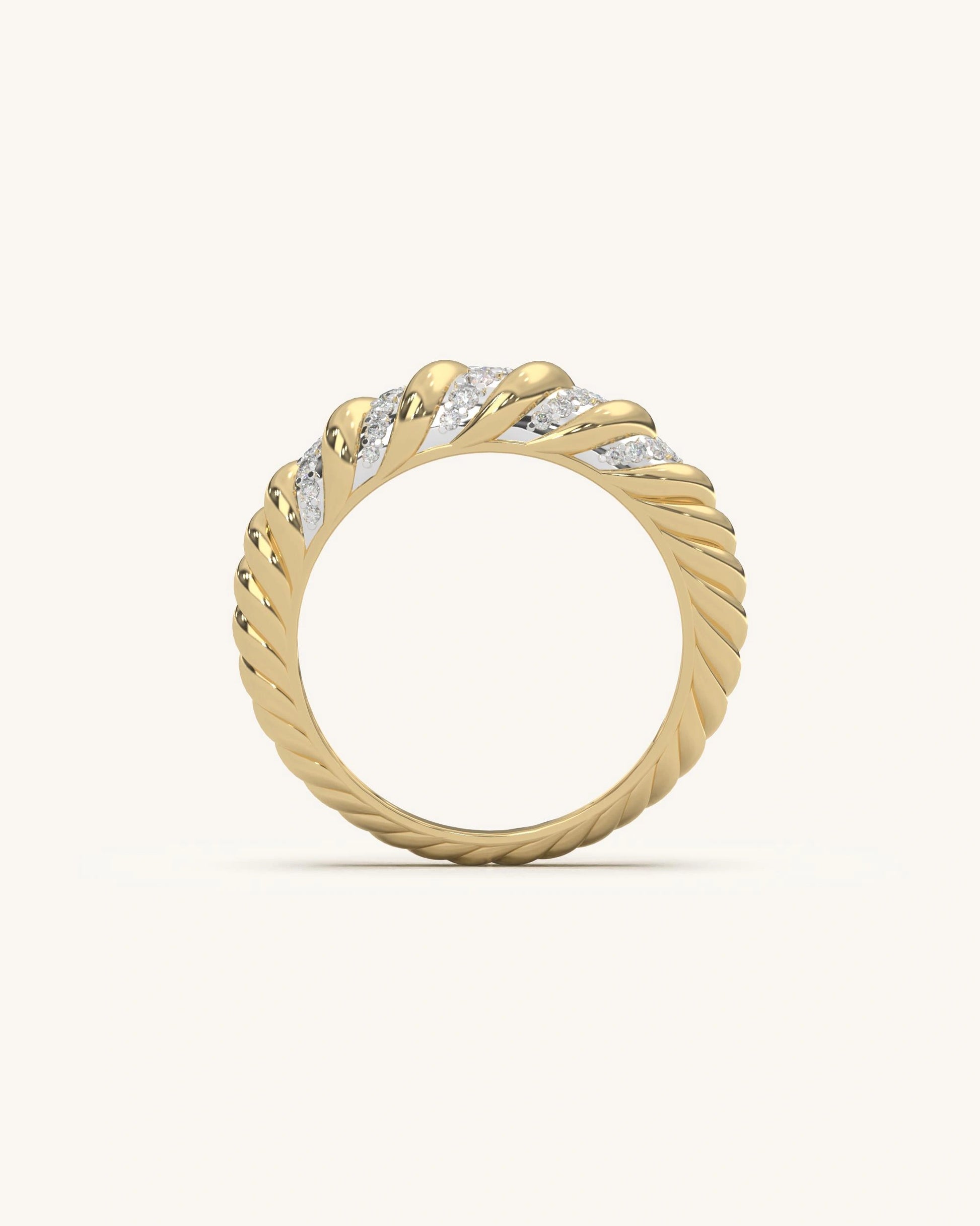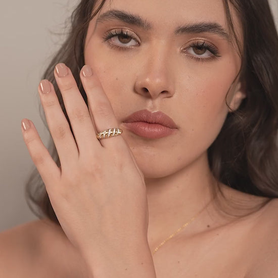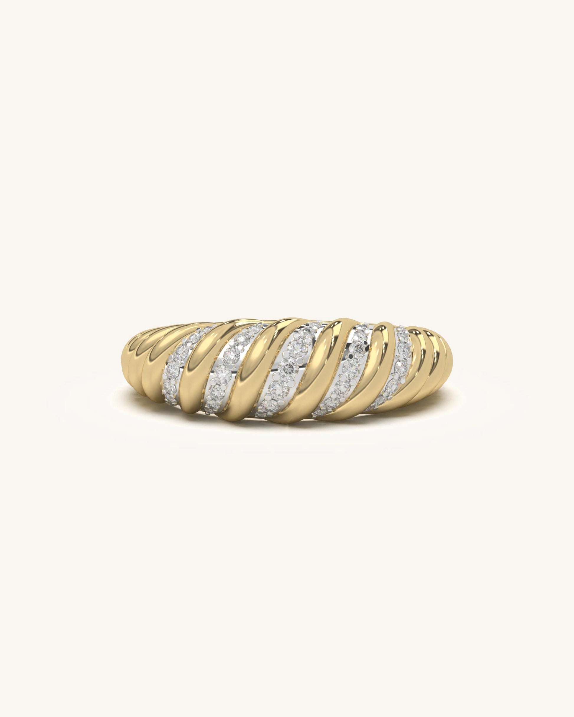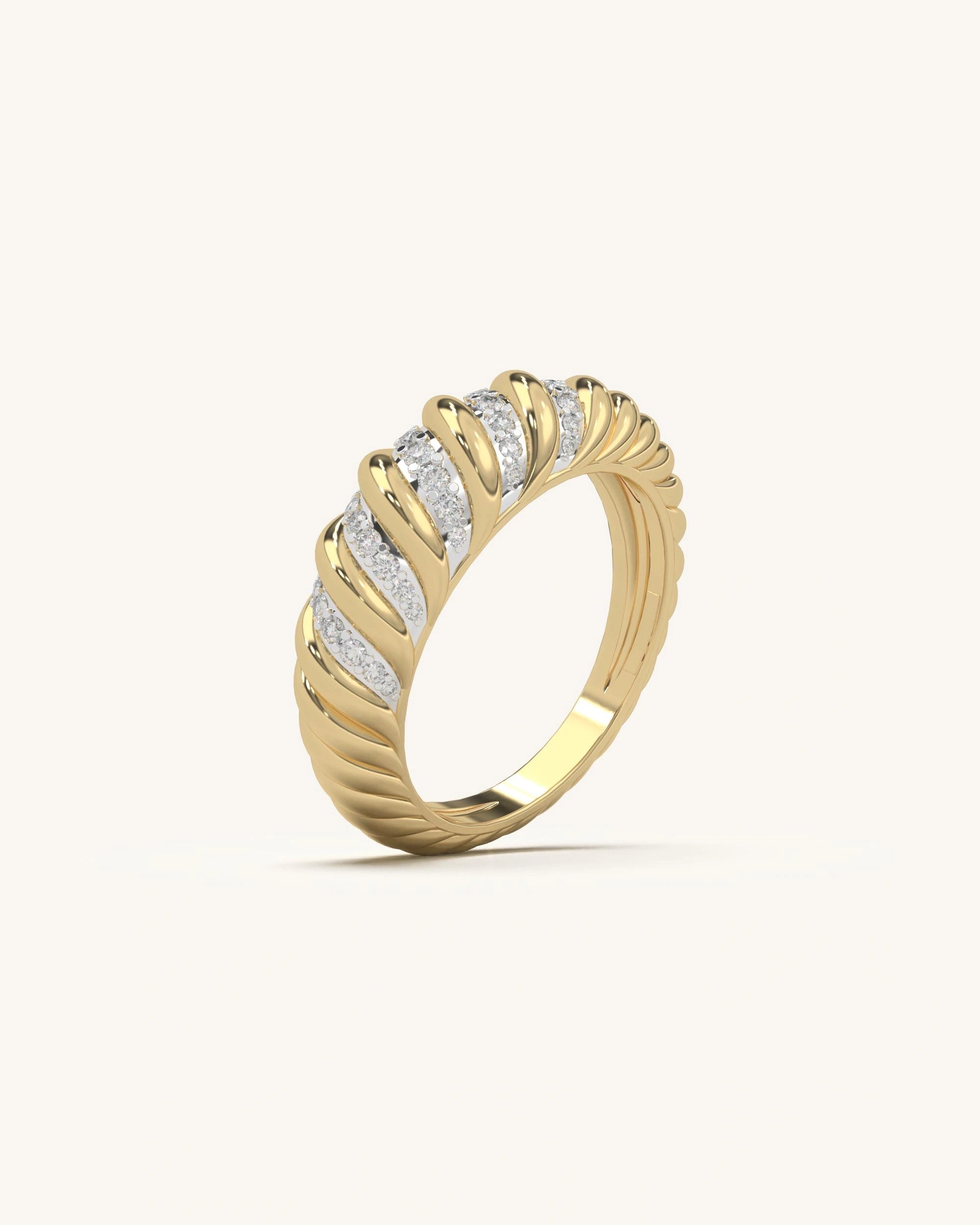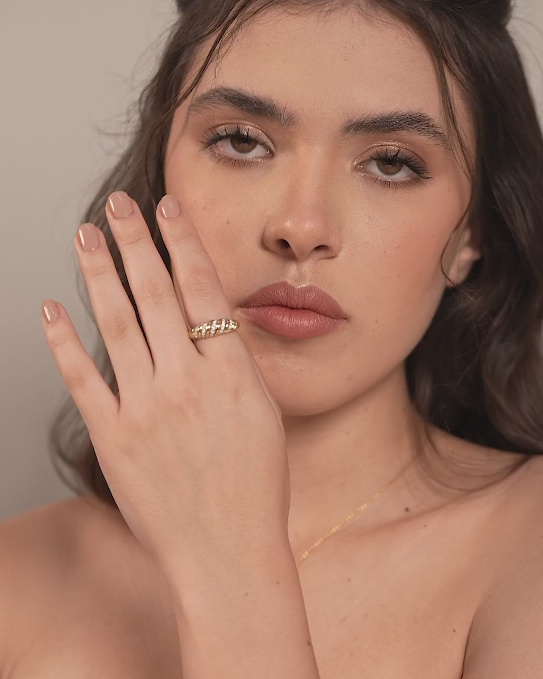 Made from 925 silver, finished in gold tone. Moissanite diamonds add brilliance. Smooth inner band for comfort. Durable and nickel-free design.