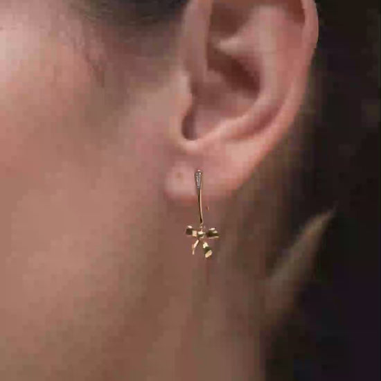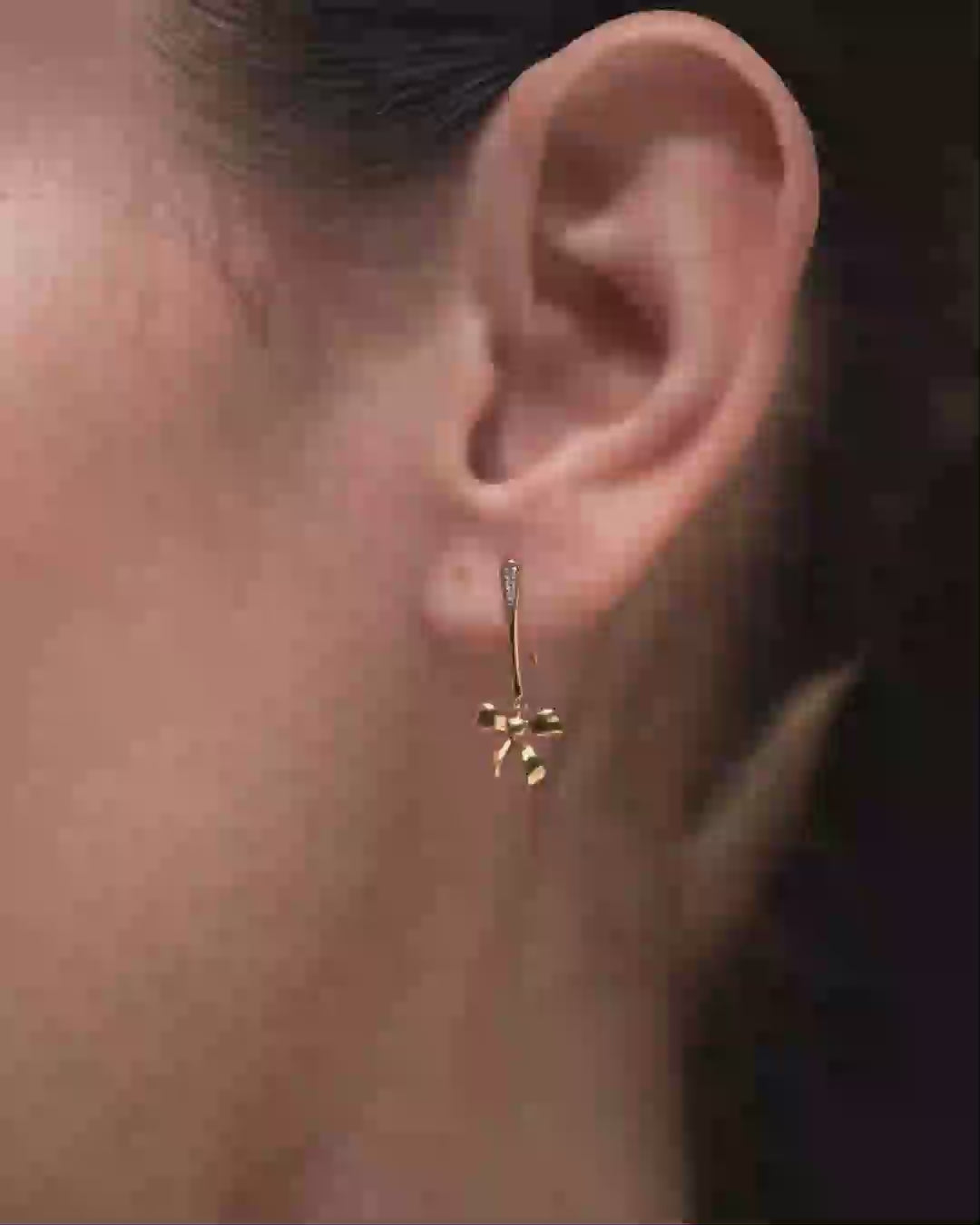 Modern earrings featuring a matte-finished gold bow suspended from a slim, diamond-studded white bar. The fusion of tones and the drop silhouette offer a refined and stylish statement.