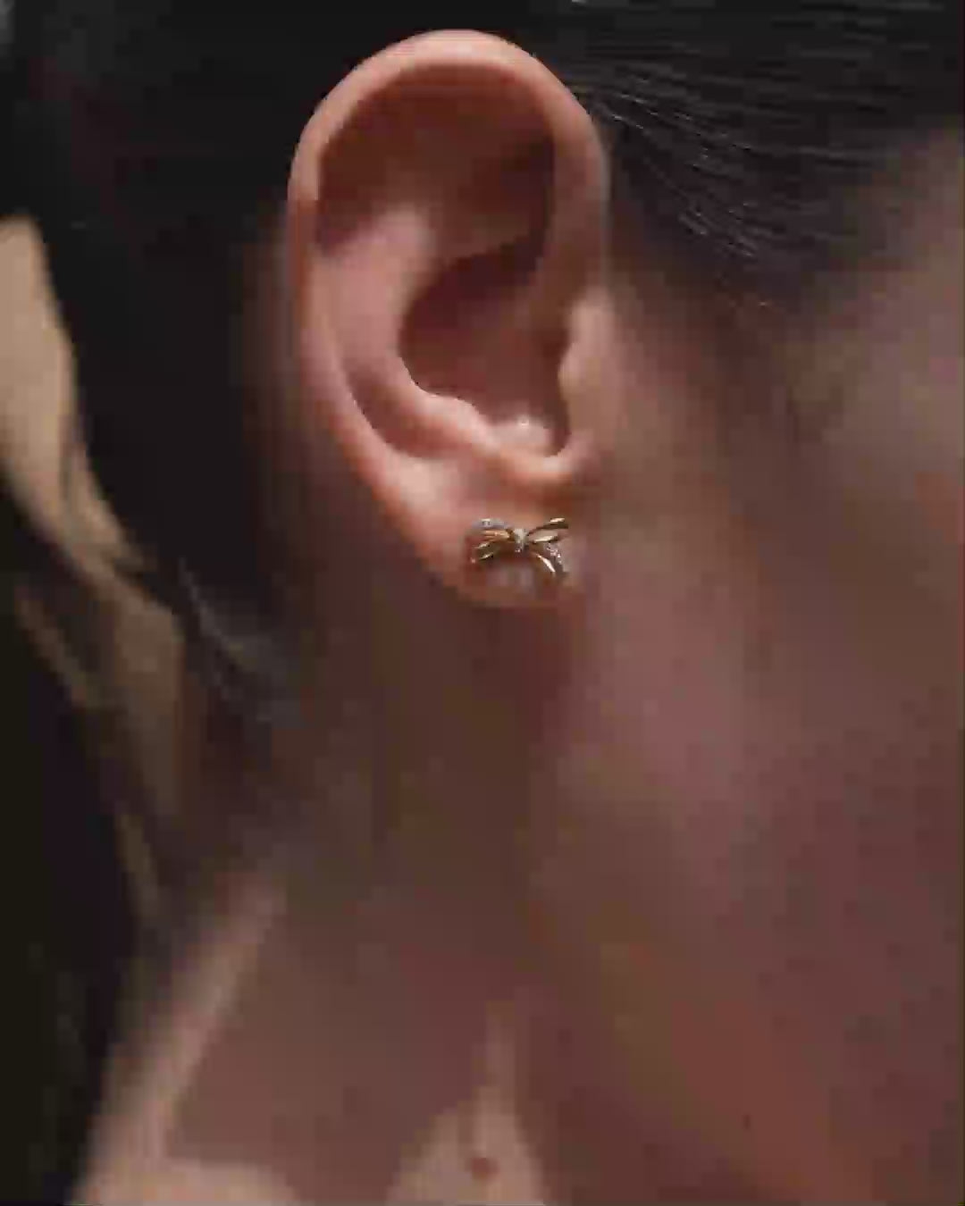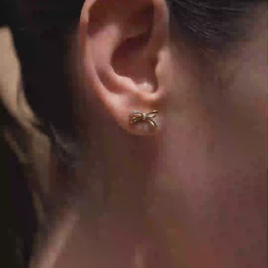 These earrings showcase a curved knot design with moissanite on one side and a sleek gold ribbon on the other. Perfectly balanced and modern.