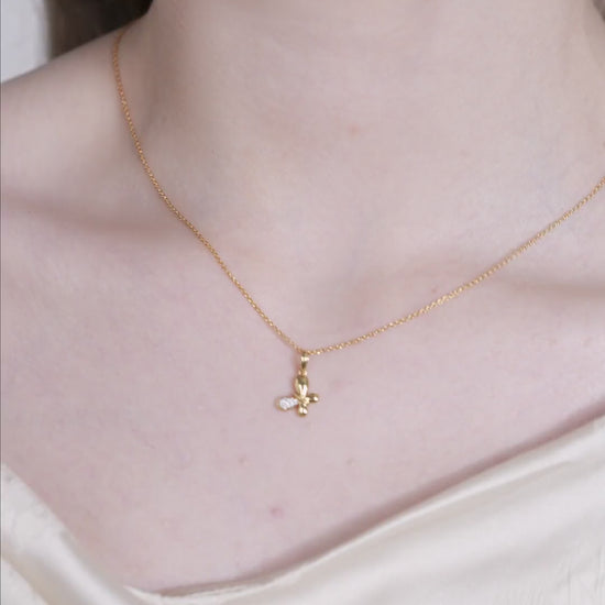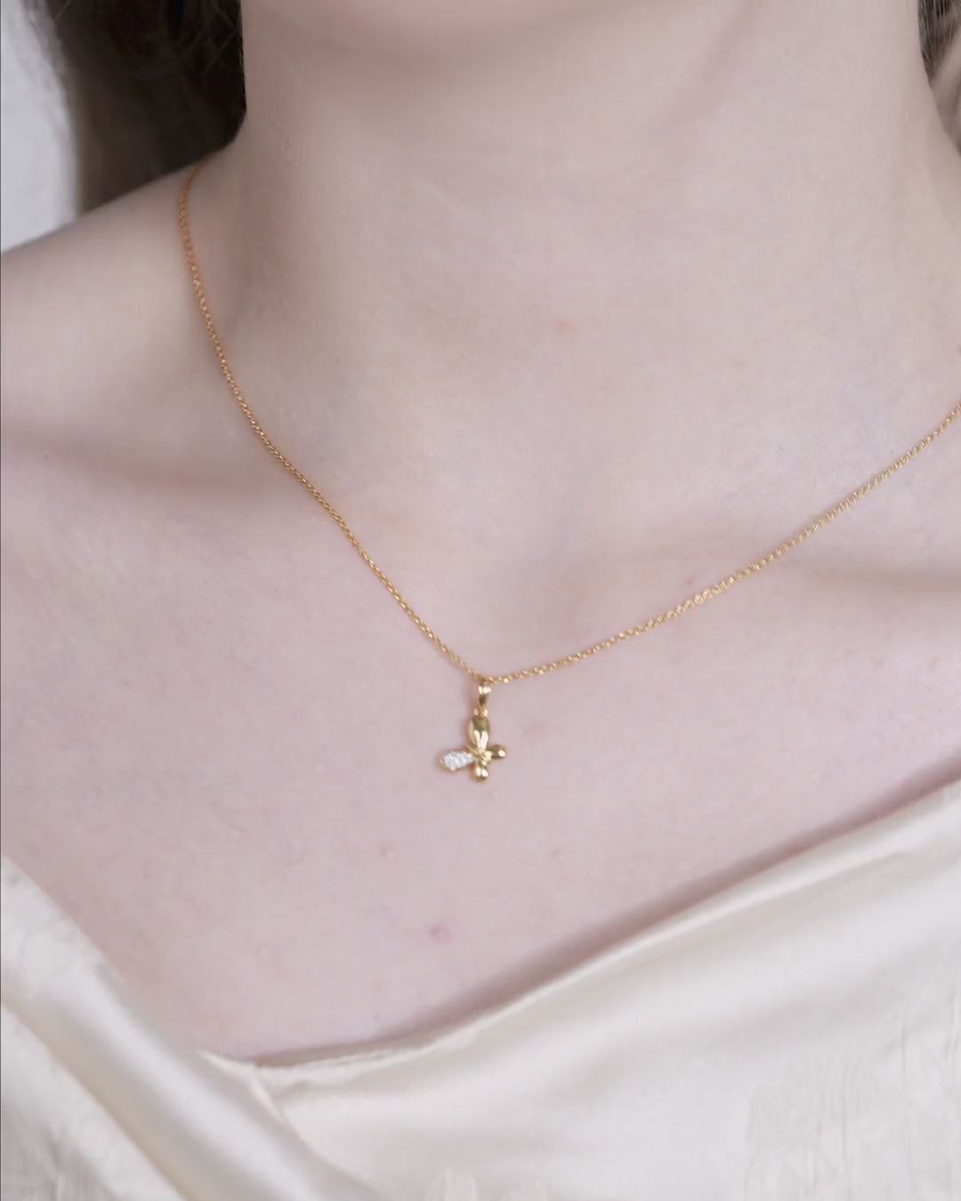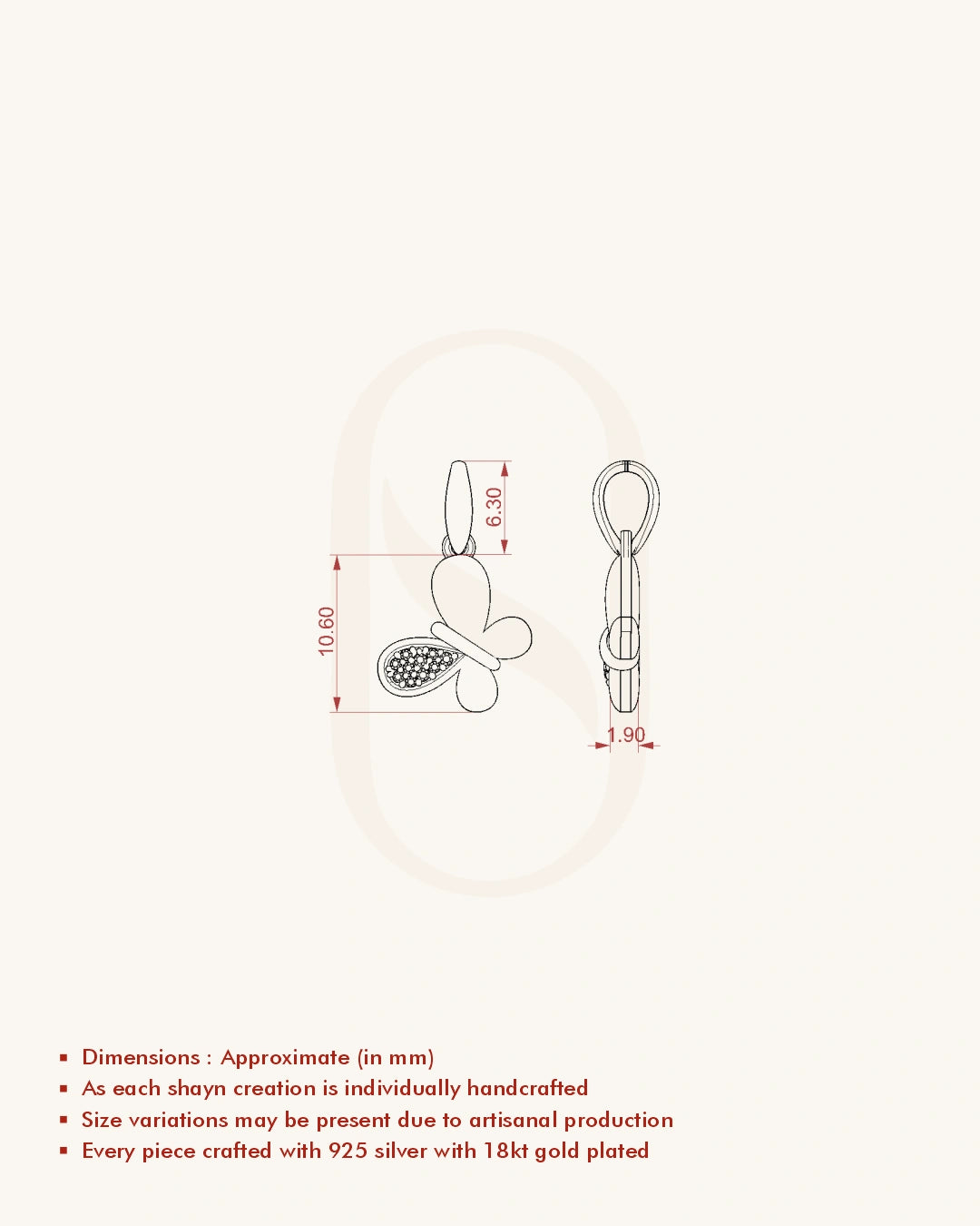 Composed of solid 925 silver and gold plated this piece features moissanite detailing on one wing for a playful asymmetrical shimmer.