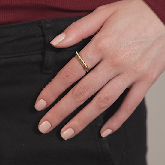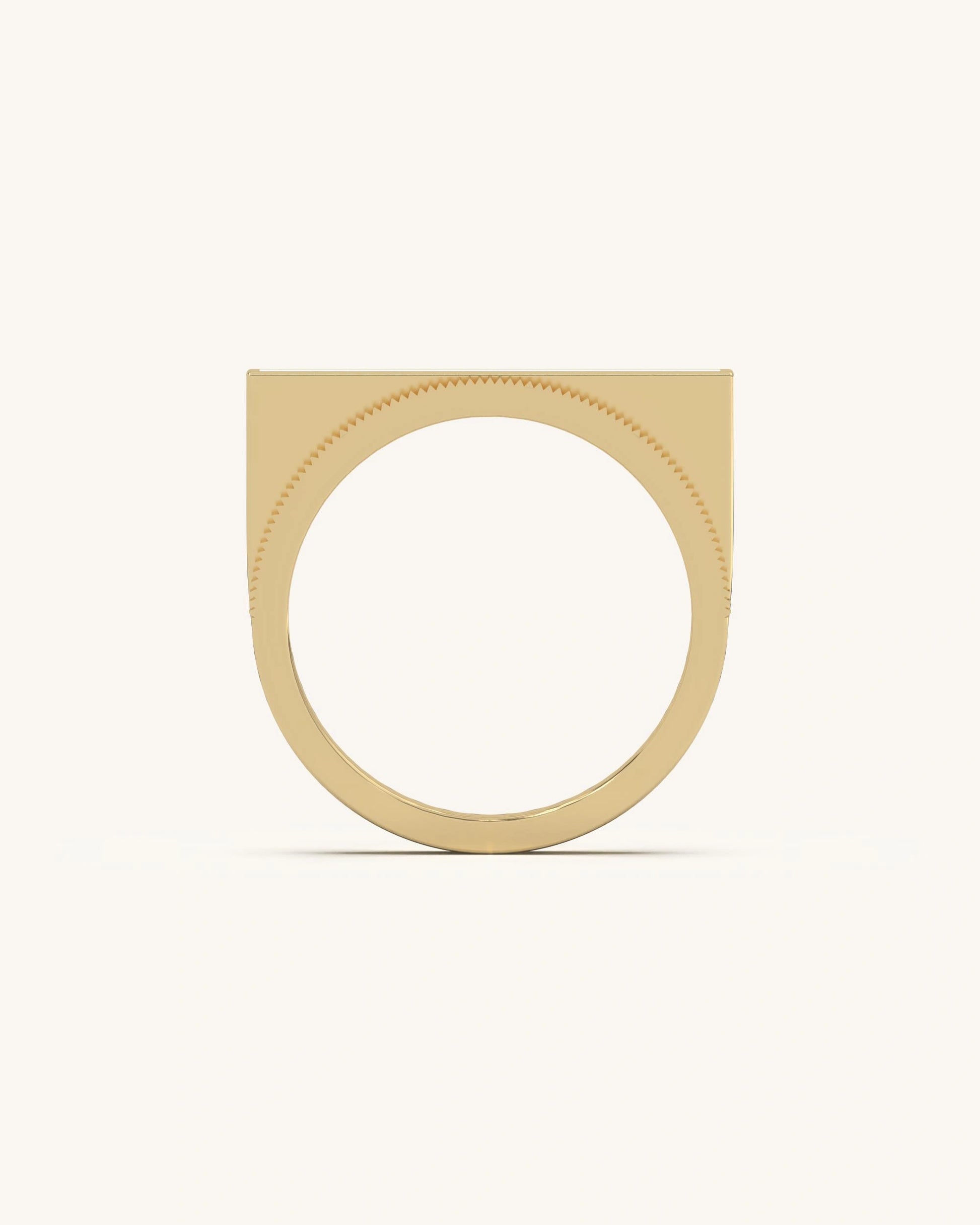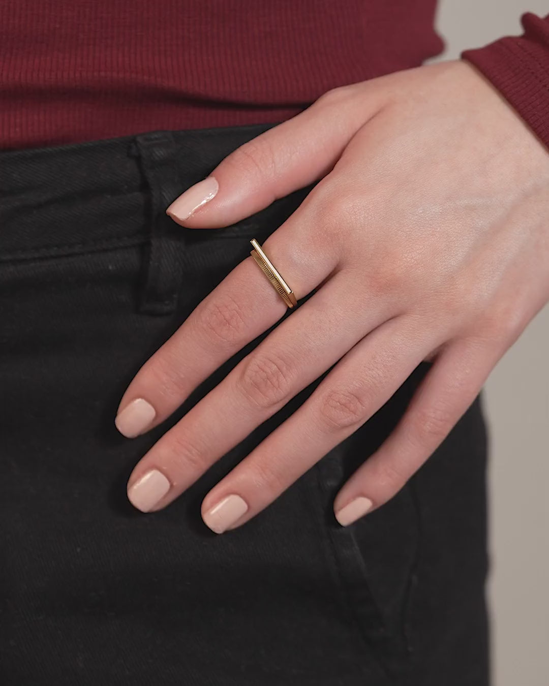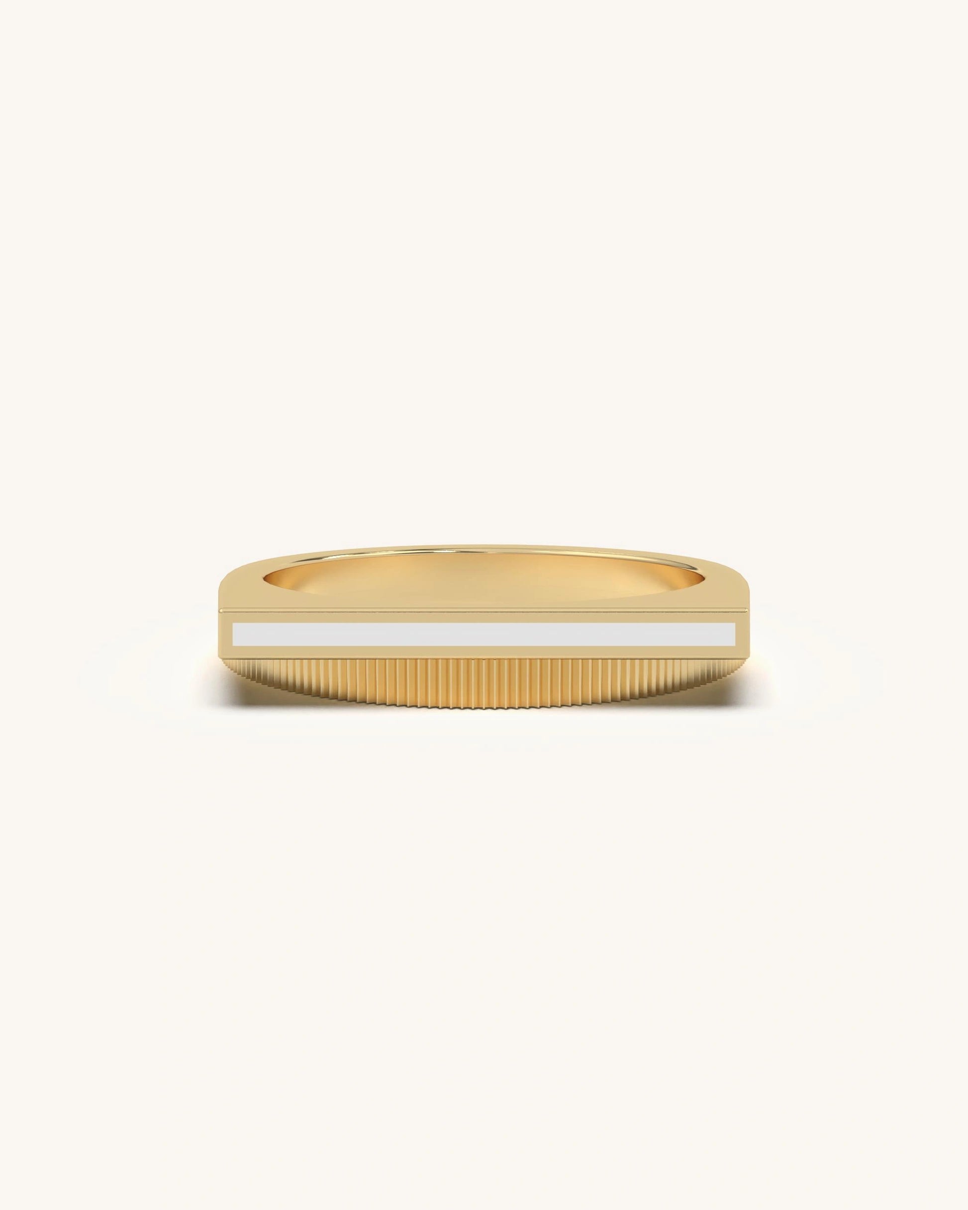 A minimal gold ring with a smooth rectangular band, accented by a clean white enamel strip for a modern, unisex look.
